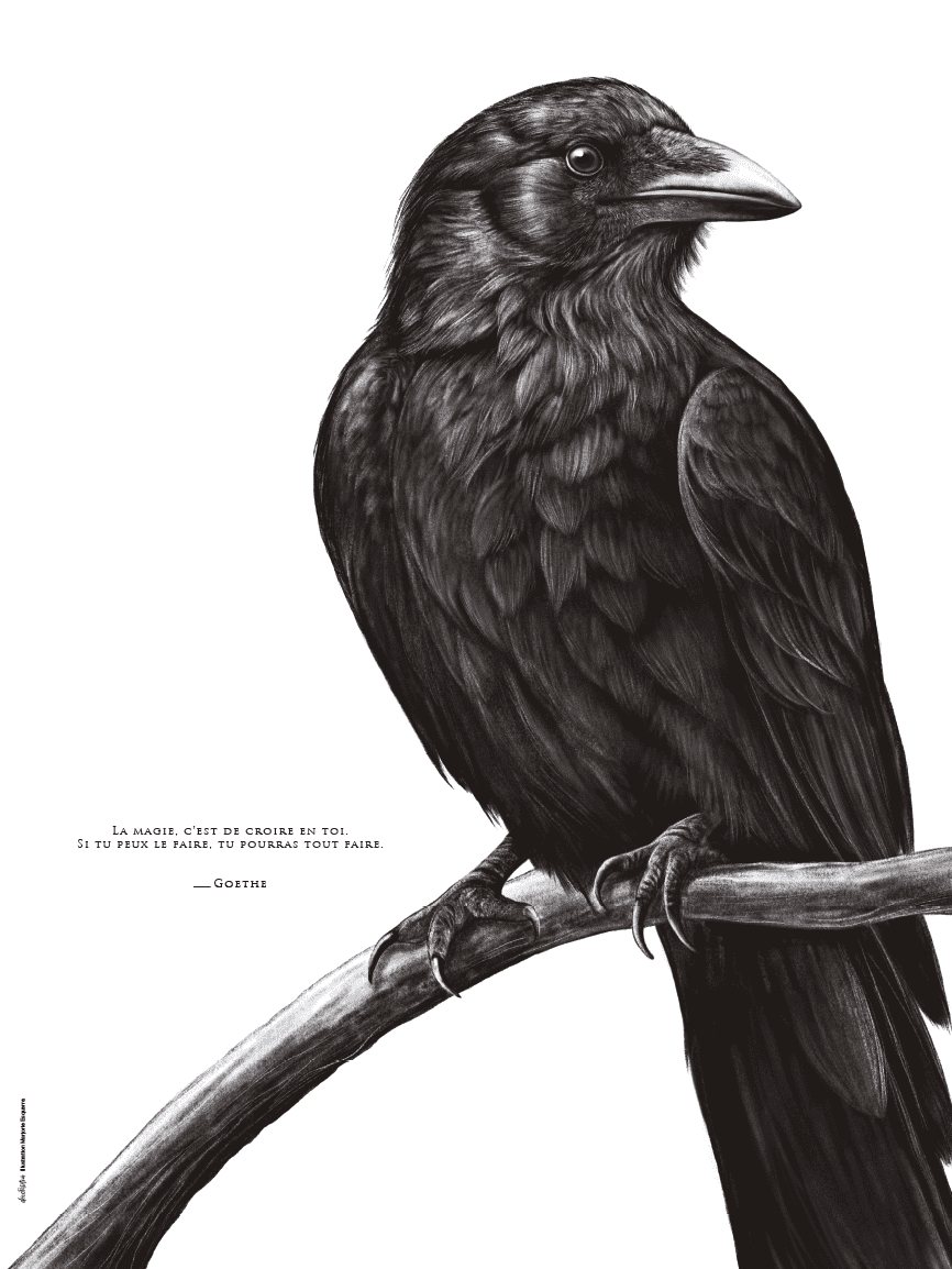 Associé à la magie depuis des siècles, le corbeau rappelle que le pouvoir le plus important est celui que l’on porte déjà en soi. La citation de Goethe renforce cette idée : croire en soi ouvre la voie à toutes les possibilités.